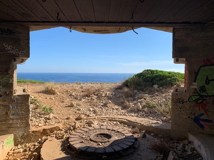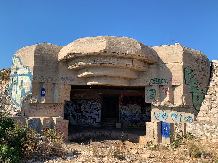 From Mallorca I took the ferry across the Balearic Sea to Barcelona, a journey which afforded ample views of “havens and harbours”, as well as Montjuïc Castle as we came into port, the slab-like profile of the 17th century fortress more like mid-20th century fortifications than a castle. Off the coast of Marseille I encountered both on one short boat trip: 16th century Château d’If, notable as a setting in Dumas’ Conte de Monte Cristo, and a little further out the island of Pomègues , on the southern tip of which squats a World War II battery and barracks, now occupied by thousands of seagulls.